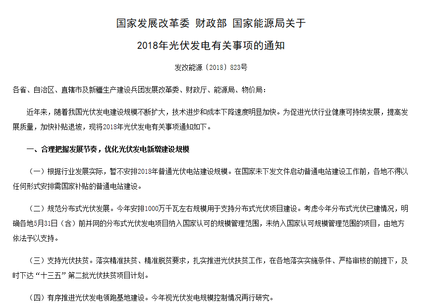 5月31日,大部分光伏人还沉浸在SNEC展会这一年一度的盛会余热中,国家发改委、财政部、能源局三部委联合下发的一纸文件《关于2018年光伏发电有关事项的通知》,犹如一盆冷水重重地浇在光伏人的头上,震惊了整个光伏圈。