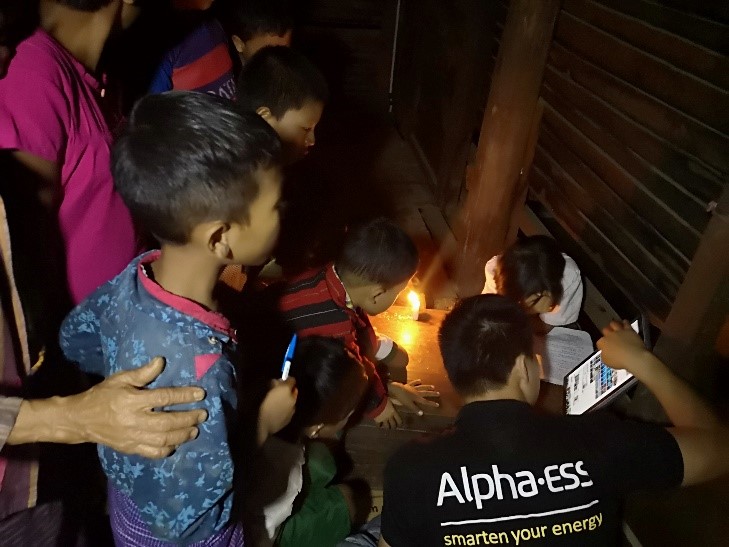 G22恒峰国际能源亚太区销售总监带队亲赴现场,与工程师们在缅甸村庄连续调试两周。颠簸的山路,飞舞的蚊虫,简陋的饭菜,湿热的气候,把人压得喘不过气来,连续的山路晕车和膳食不均加重了工作难度,但在工作之余陪伴孩子们在烛光中一起夜读外界大千世界,看着笑容挂上孩童的面庞,疲劳顷刻烟消云散。在第一个项目傍晚顺利通电时,清冷的村庄瞬间热闹起来,村民们的欢呼喝彩给予了工作人员源源不断的动力。